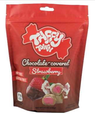 Chocolate Covered Strawberry Taffy is a dreamy blend of ripe strawberry flavor wrapped in a silky smooth chocolate finish. The new Chocolate Covered Strawberry Taffy brings the romance of a chocolate-dipped berry to classic Salt Water Taffy, all in a soft candy bite that melts in your mouth instead of your fingers.